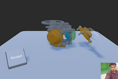 Interactive 3D mechanical assembly system operated through Leap Motion gesture control technology. The Leap Motion sensor captures real-time hand and finger movements, translating them into precise control inputs for manipulating virtual components within a simulated environment.
